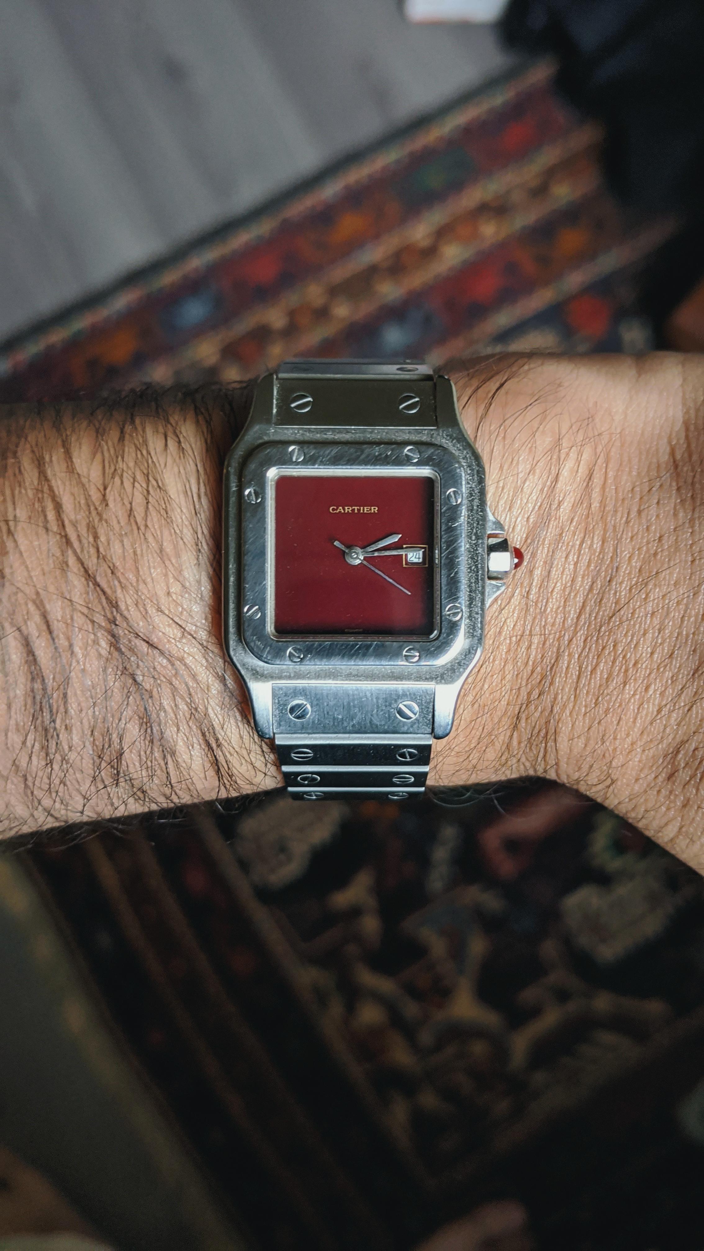This is my third santos carree, and probably my favorite due to that amazing deep red dial along with the... $151 for 24 months with paypal creditopens a installment calculator layer* $151 for 24 months.. This is a nice first gen cartier santos carrée automatic men's watch from the 1980's.